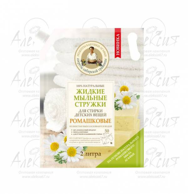 Жидкие мыльные стружки для стирки детских вещей «ромашковые» Жидкие мыльные стружки настоящая находка для хозяйки, которая ценит натуральность и простоту использования. Мыльные стружки изготовлены из свежесваренного мыла Агафьи на основе натуральных омыленных масел кедра, горчицы и ромашки с добавлением отваров сибирских трав. Благодаря чему жидкие мыльные стружки на 100% безопасны,экологичны и натуральны. Жидкие мыльные стружки не содержат парабенов, SLS, EDTA и NTA, нефтепродуктов, фосфатов, фталатов, фенолов, формальдегида и других токсичных веществ.