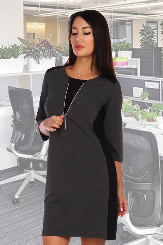 Платье приталенного силуэта, рукав 3/4. Горловина декорирована функциональной молнией.