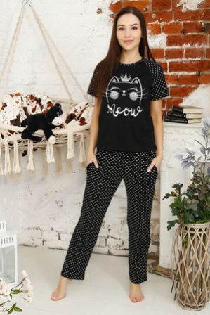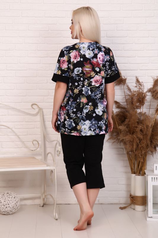 Женский костюм из кулирки кофта+бриджи. Кофта из набивной ткани, горловина V-образная, короткие рукава с манжетами, бриджи из однотонной ткани с карманами
