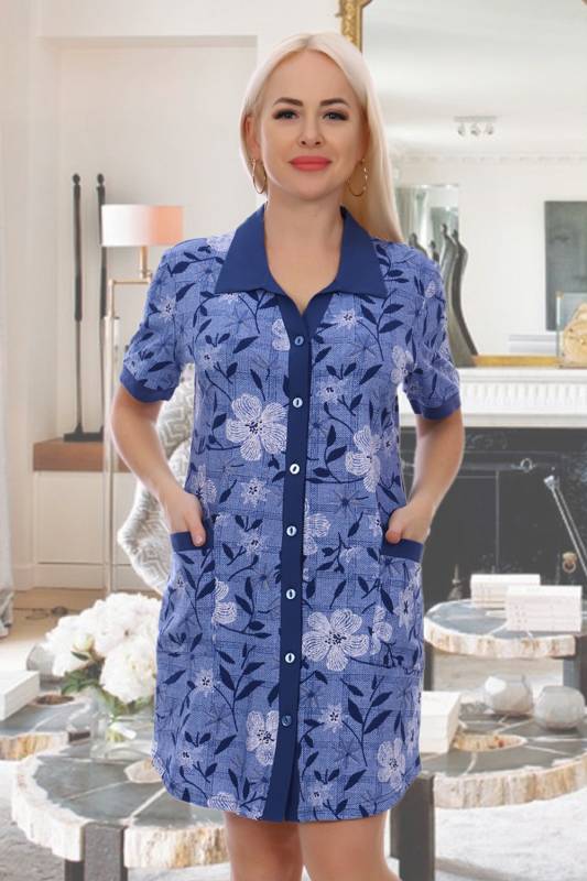 Халат женский на пуговицах, с V-образным раскрытием планок, с короткими рукавами и карманами в боковых швах.