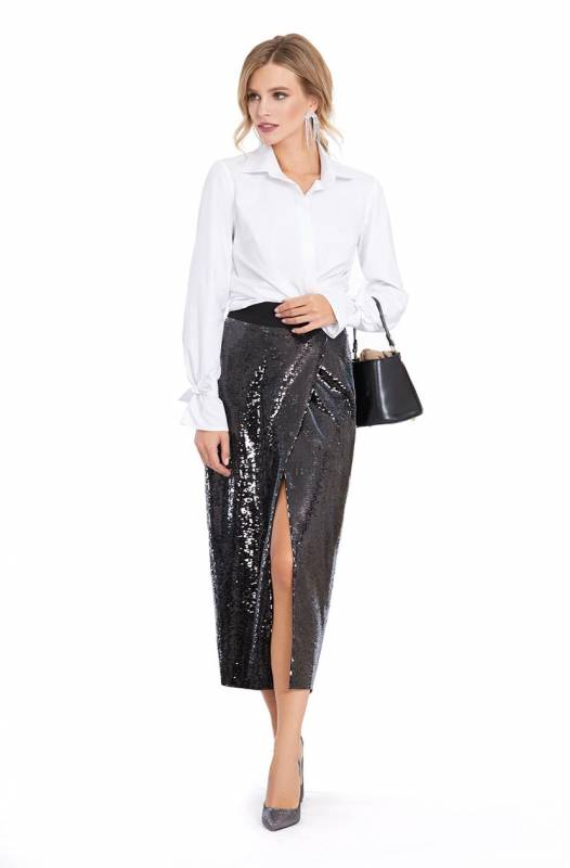 Комплект-двойка из хлопковой рубашки и юбки на запах из ткани в пайетки.