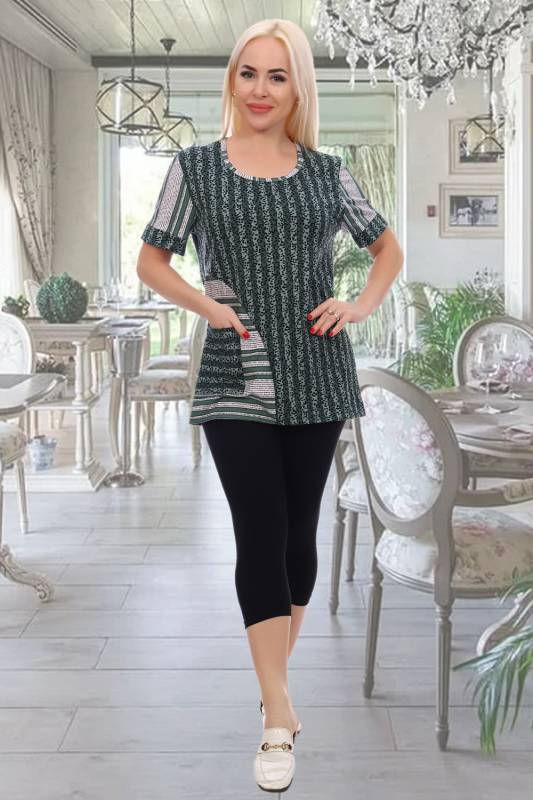 Женский костюм с бриджами полуприталенного силуэта. На полочке с правой стороны подрез, на котором находится накладной карман. Длина чуть ниже бедер, короткий рукав с манжетом. Подрез на полочке, рукав и окантовка горловины выполнены из ткани-компаньона.