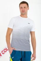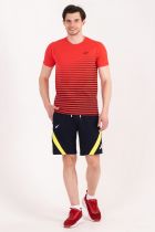 Футболка мужская. Круглый вырез горловины, на передней части принт в виде полос и небольшая печать. На левом рукаве и на спине так же печать в виде логотипа.