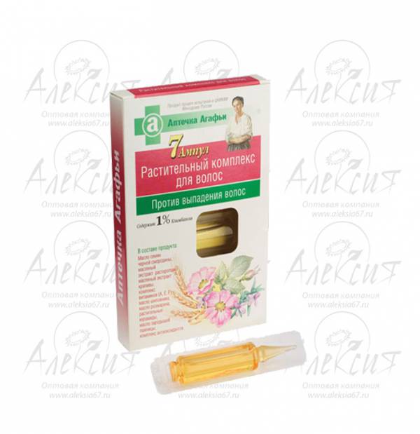 Масляный растительный комплекс в ампулах против выпадения волос обладает повышенным укрепляющим действием. Каждая ампула содержит сбалансированные активные вещества: растительные керамиды, соевое масло, репейное масло, комплекс витаминов (A, E, F), масляный экстракт крапивы, масло зародышей пшеницы, масляный экстракт расторопши, масло шиповника, масло розмарина, масло черной смородины, климбазол, комплекс антиоксидантов. Растительный комплекс рекомендуется для оздоровления и укрепления корней волос. Продукт прошел лабораторные испытания в ЦНИКВИ Минздрава России.