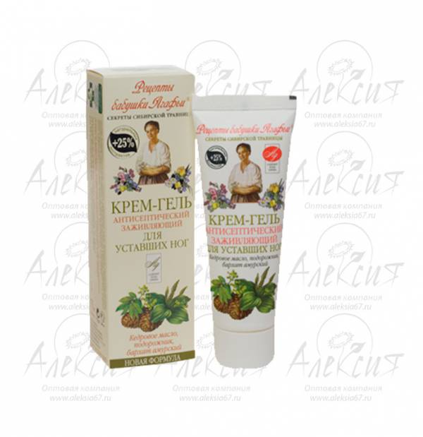 Крем-гель создан по оригинальному рецепту сибирской травницы Агафьи Ермаковой. Благодаря сбору целебных трав, входящих в его состав, обладает антисептическим, заживляющим действием, эффективно снимает усталость ног. Крем-гель смягчает, успокаивает, снимает шелушение, дарит ощущение комфорта. Крем-гель содержит ионы серебра и способствует более активному процессу обновления клеток и омоложению кожи.