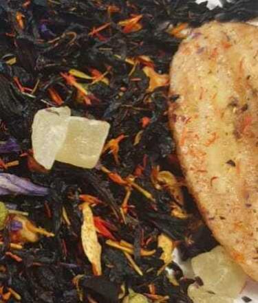 Состав: чай черный ассам, банановые чипсы, лепестки апельсинового дерева, шафран, цукаты, яблоко, мальва.