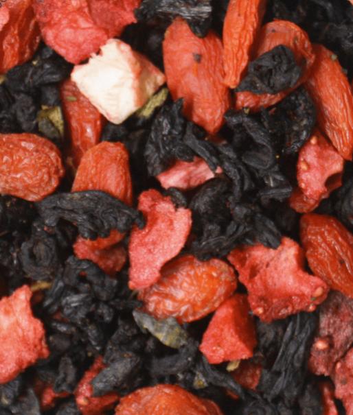 Купаж из классических черных индийских чаев с добавлением ягод годжи, сублимированных кусочков земляники. Содержит пищевые ароматические масла.
