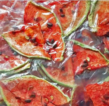Высушенный на специализированном оборудовании при низких температурах, арбуз сохраняет практически все свои полезные свойства и витамины. При сушке он усыхает в 20 раз, таким образом, откушав 100 грамм сушенных ломтиков арбуза, вы получаете такое же количество витаминов и полезных веществ, которое содержится в 2 килограммах свежего арбуза.