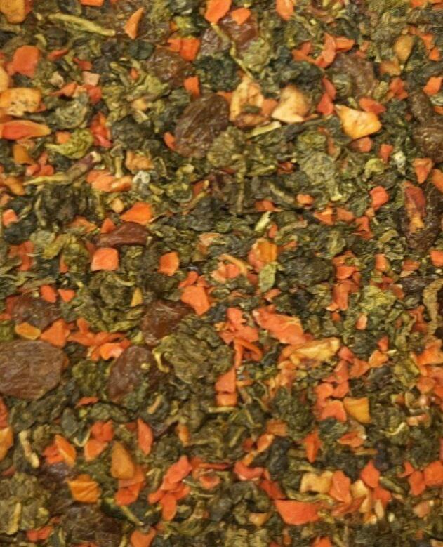 Китайский улун с шиповником, изюм, цукаты моркови и яблок с кисло-сладкими нотами во вкусе.