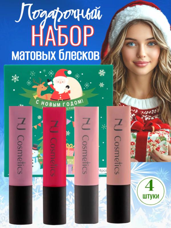 Подарочный набор матовых блесков для губ. Мягкий, словно бархат, ультра-кремовый блеск для NJ Cosmetics плавно скользит по губам, создавая утонченный образ. Сочетая насыщенный цвет со стойкой формулой ,блеск придает губам матовый оттенок и выразительный объем.