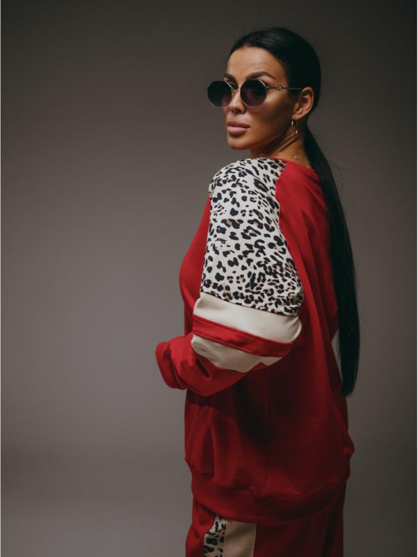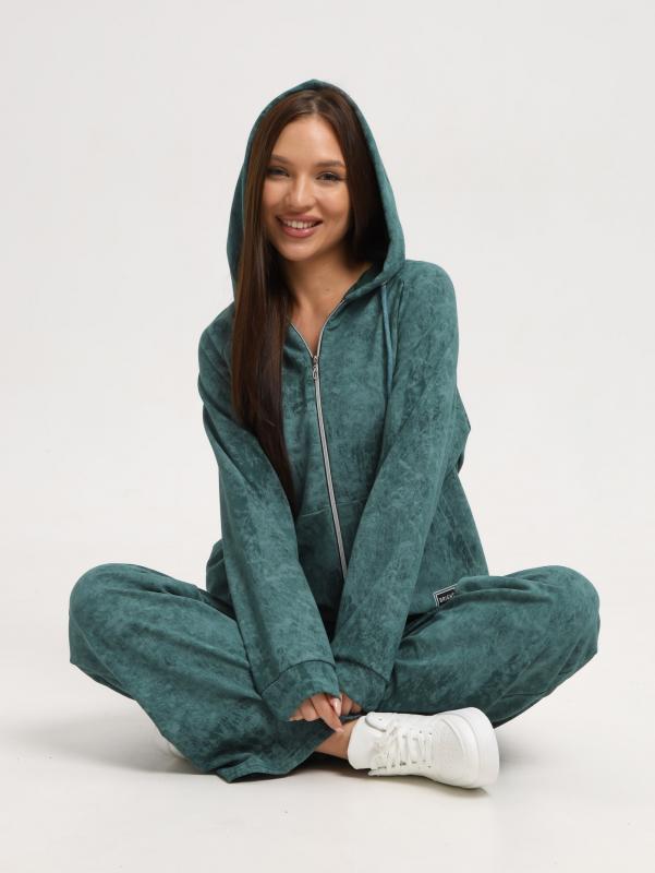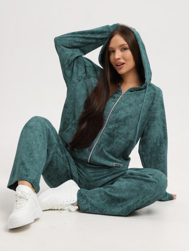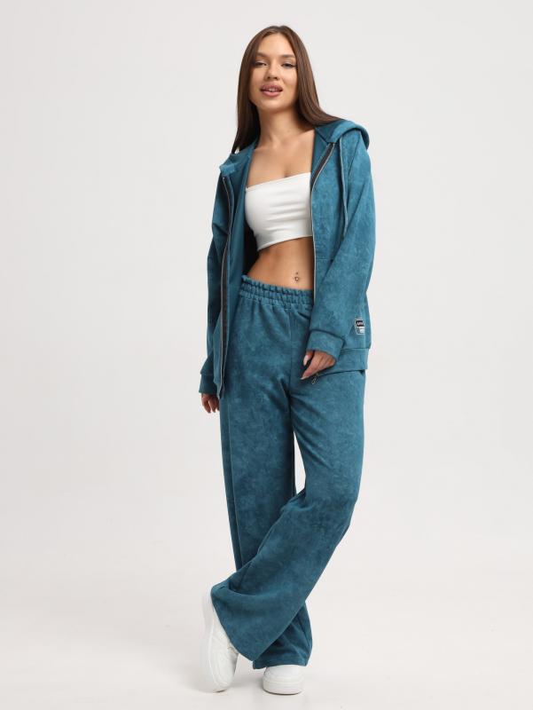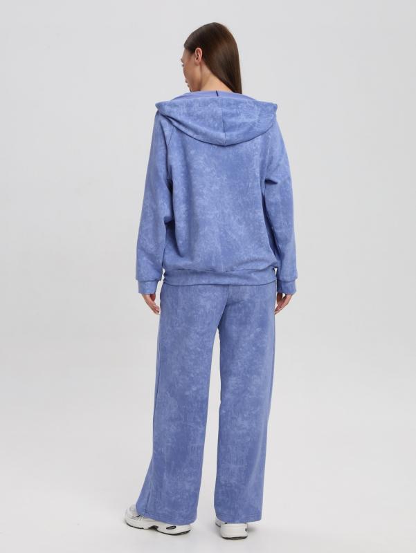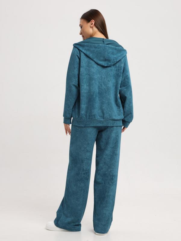 Костюм Хлоя состоит из свитшота и брюк. Свитшот прямого силуэта с рукавом реглан со вставками. Брюки на поясе с двумя боковыми прорезными карманами.