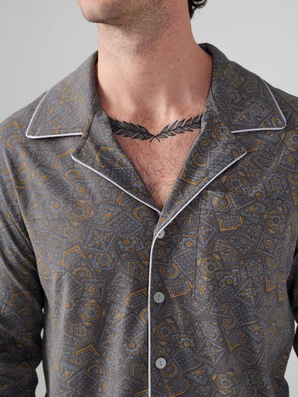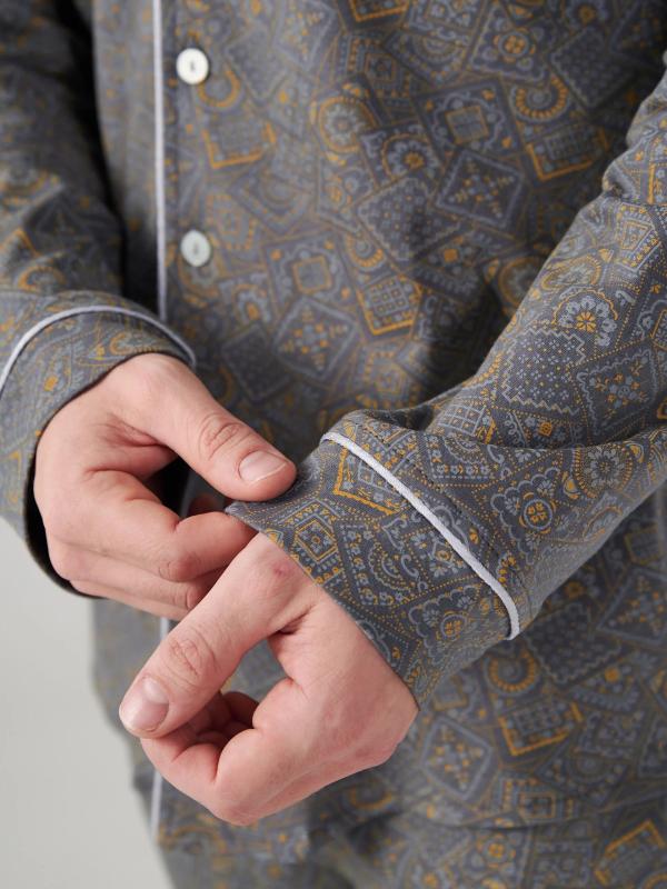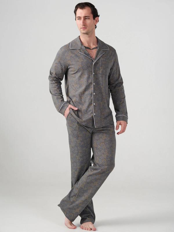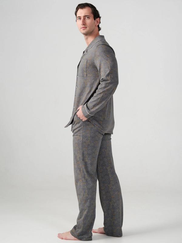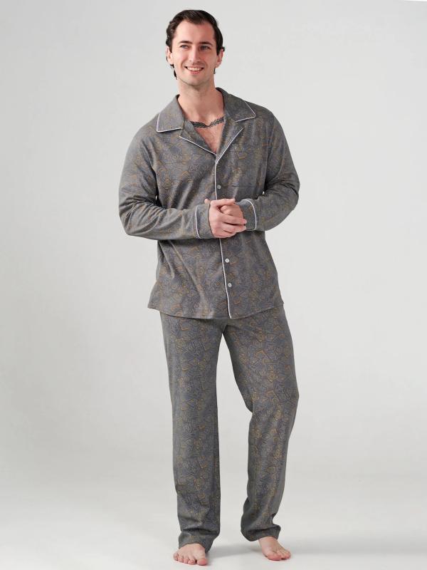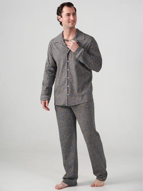 Пижама мужская "Династия" (классическая) 2404-К состоит из пижамной куртки и брюк. Куртка с отложным воротником, с застежкой на петли и пуговицы. На левой полочке накладной нагрудный кармашек. Рукав длинный втачной на манжете. По линии борта, отлету верхнего воротника, и манжету рукава проложен отделочный кант. Низ изделия обработан швом «в подгибку». Брюки прямого силуэта с боковыми карманами, цельнокроеным поясом на резинке.