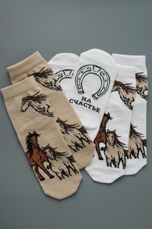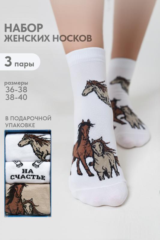Комплект женских носков с новогодней тематикой. В наборе 3 пары разного цвета. Упаковано в подарочную коробку.