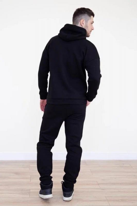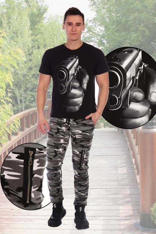Стильный молодёжный костюм в стиле милитари, состоящий из футболки чёрного цвета с крупным принтом и брюк камуфлированной расцветки, дополненных накладным карманом с металлической молнией
