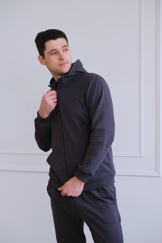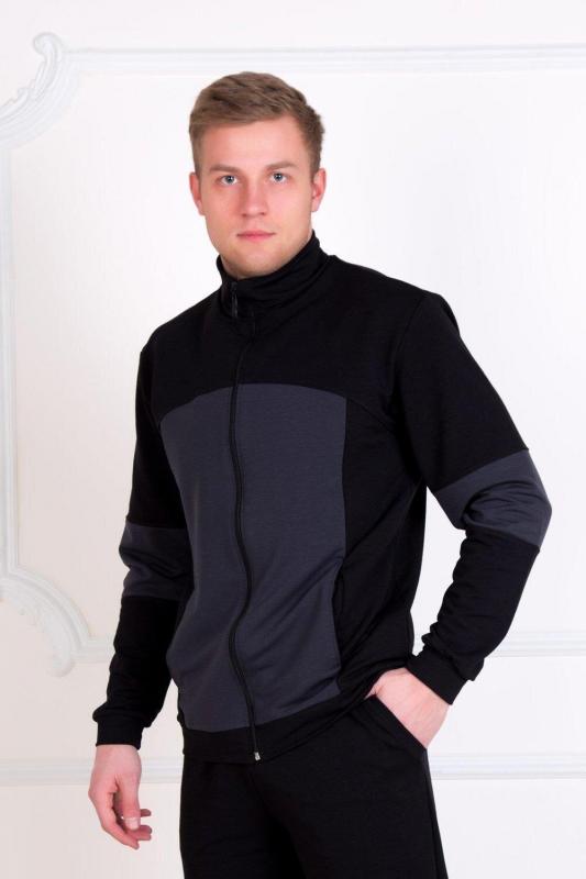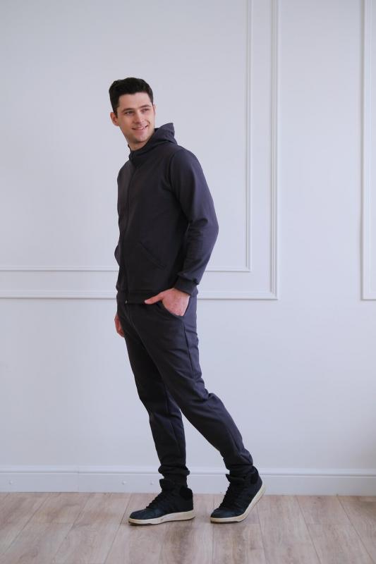 Брюки мужские спортивного силуэта. Пояс на резинке и регулируемом шнурке, низ на манжетах. Сбоку принт в виде надписи. Боковые карманы на молнии.
