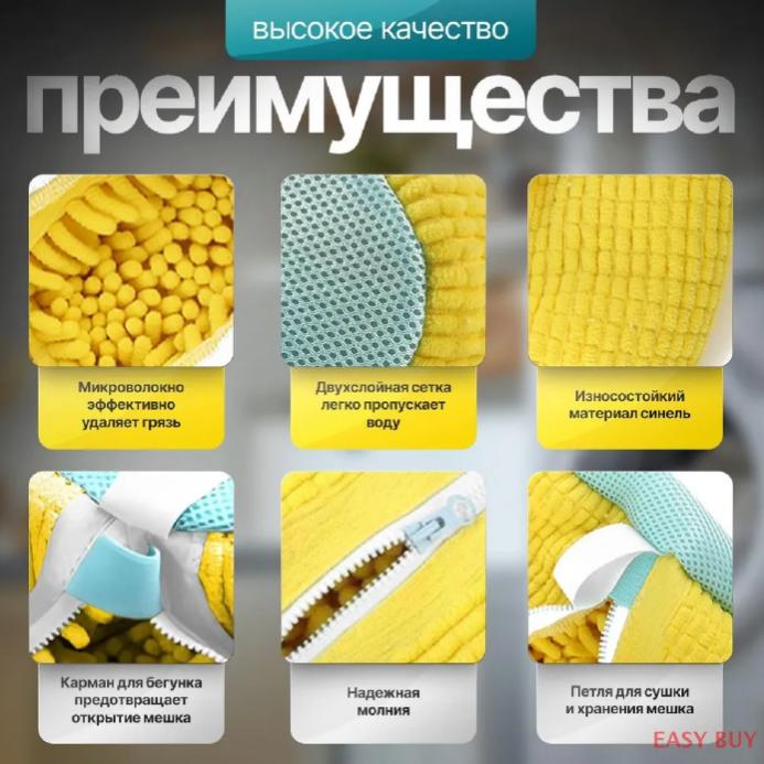 Этот мешок изготовлен из микрофибры, которая отличается деликатностью и бережным отношением к вещам.